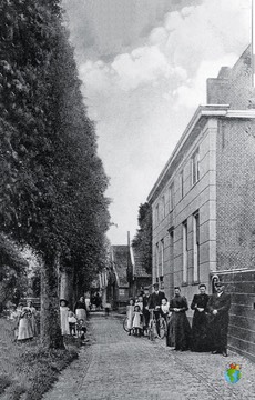 In het oude weeshuis waren de heer en mevrouw Krijger de laatste weesvader en -moeder. Zij staan rechtsvooraan op de foto met Betje van der Linden, de enige nog inwonende wees. De man op de fiets is Cor Scholten, daarnaast een van de zoons van meester Klinkenberg. Paard en wagen op de achtergrond hebben bijna de volledige breedte van de weg nodig.