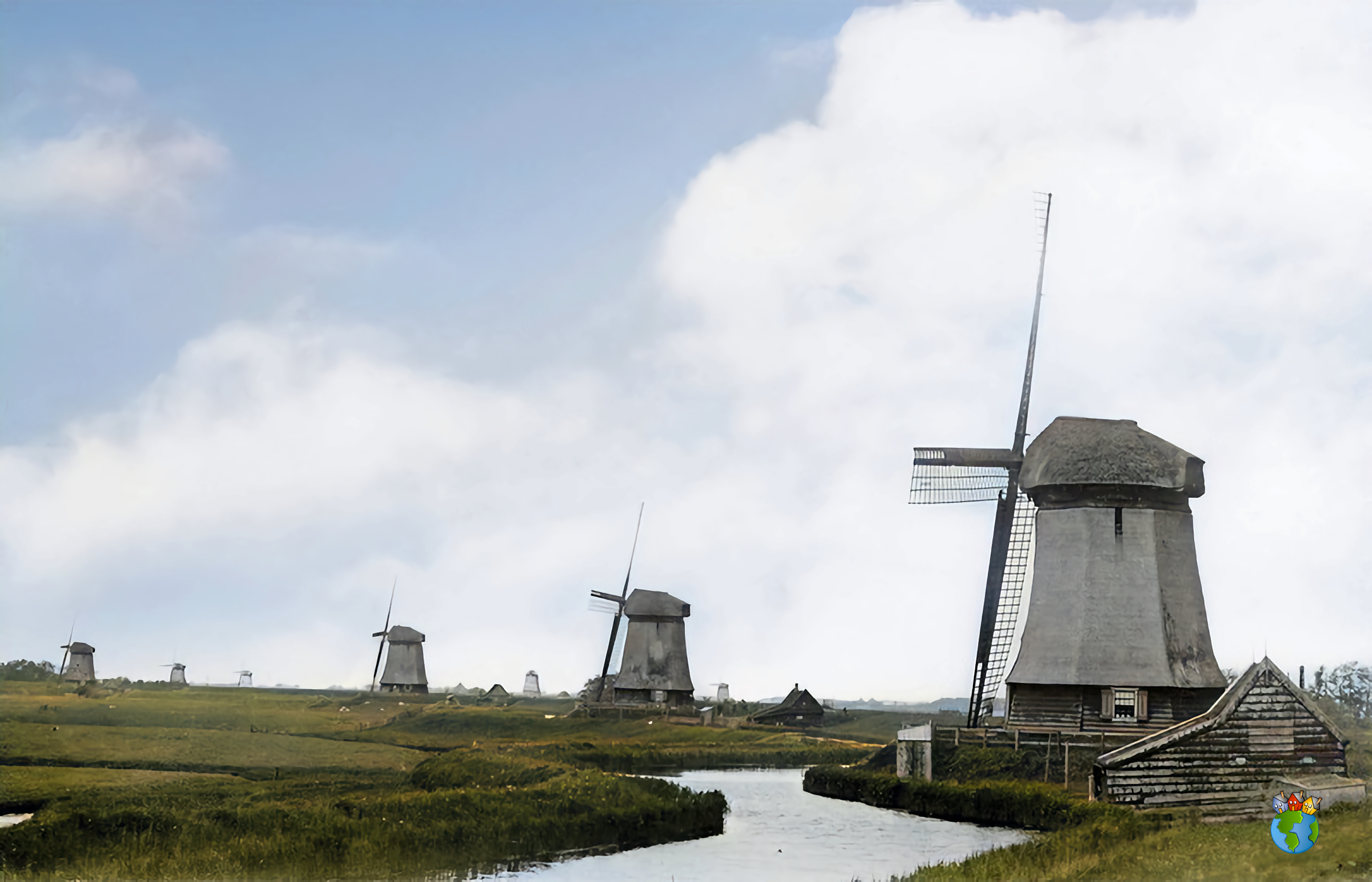 De molens verder op de dijk zijn bovenmolen 3 en 4 , middenmolen 5 etc. Tussen de bovenmolens 3 en 4 zien we in de verte de in 1919 onttakelde molen "de Wester" van de Eilandspolder. De foto dateert uit de periode 1919-1926.