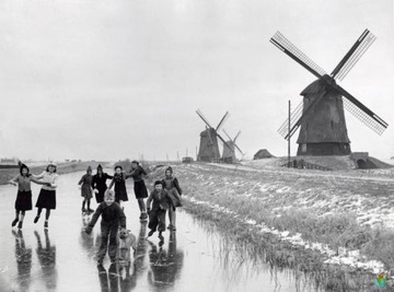 Er wordt hier geschaatst op de Noordervaart, nabij de Molengroep Schermerhorn. De foto is genomen in de richting van Schermerhorn.