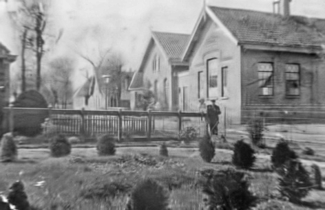 Links kruidenier Vink en rechts, verscholen achter de bomen, bakkerij Weijman