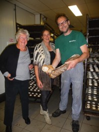 Simon, Wally en Riet Kaandorp in de grote bakkerij waar het brood voor meerdere winkel wordt gebakken.