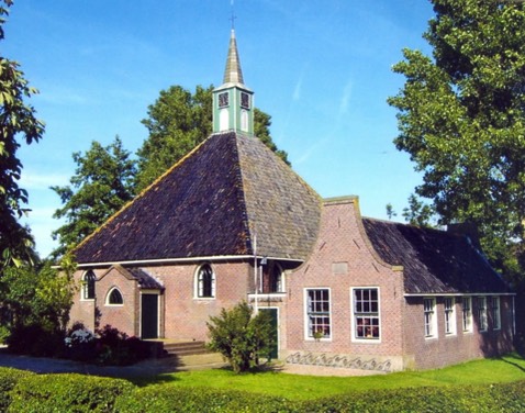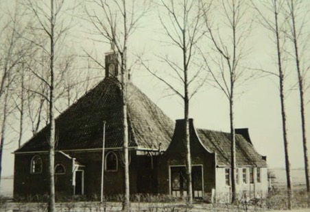 Voor een school in de Zuid-Schermer had het polderbestuur geen geld meer beschikbaar. De kerk moest een eenvoudige gebouw worden. Een afvaardiging van kerkmeesters toog met paard en kar naar Volendam om aldaar het bestek te halen van een kerkje, gebouwd in de vorm van een stolpboerderij. Niet te duur en opgetrokken van hout, met kerk en kosterwoning onder 1 dak. En zo geschiedde. Omstreeks 1665 bouwden de lokale timmerlieden Pieter en Claes Dirkz. de stolpvormige kerk .