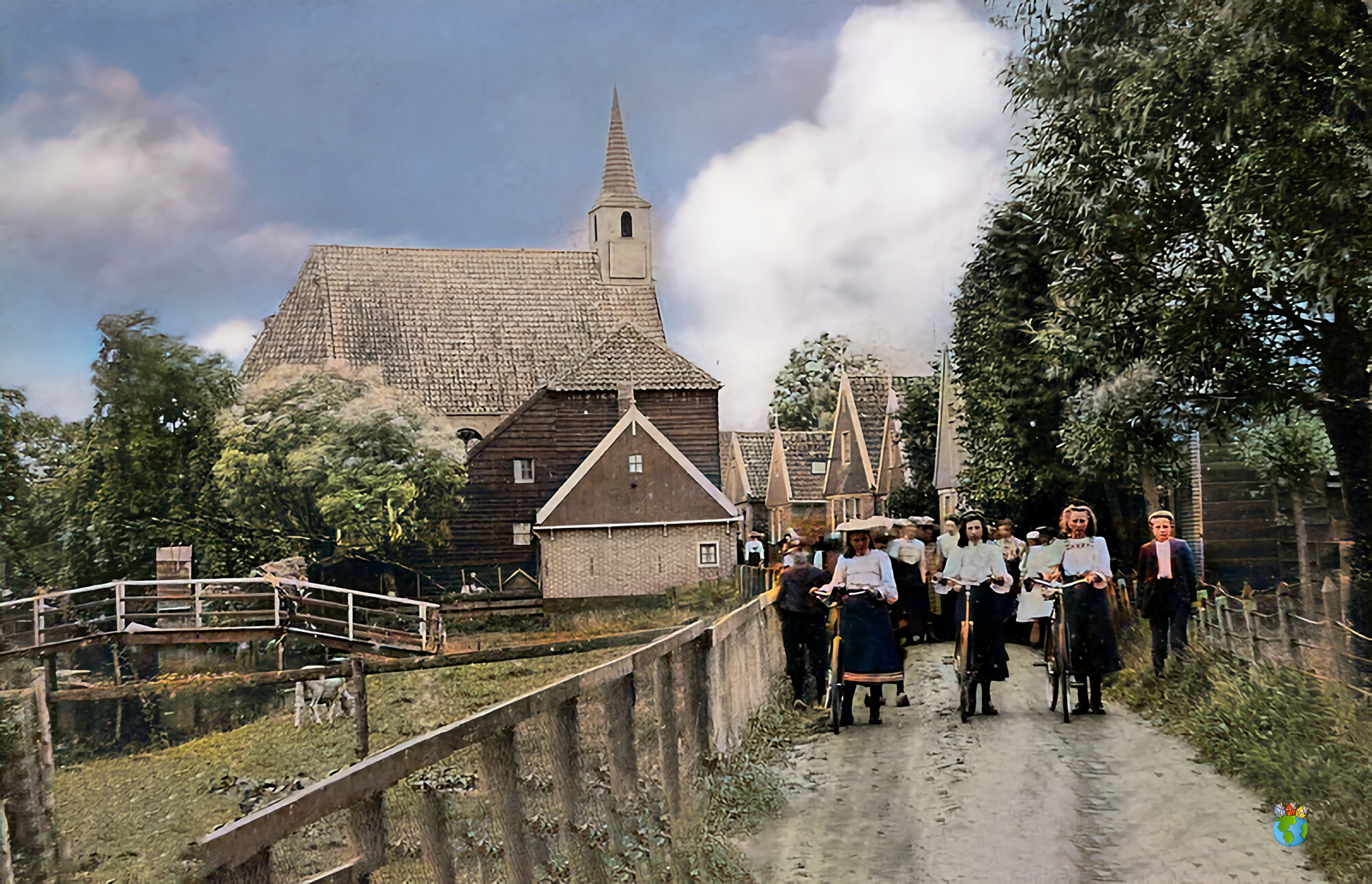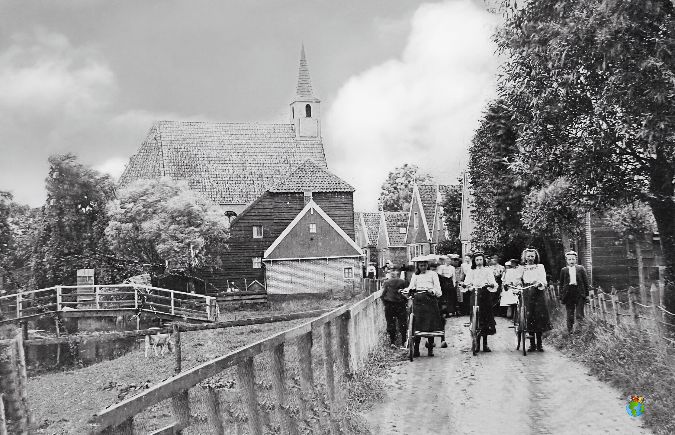 Op de voorgrond drie meisjes met fiets met daarachter een groep mensen. Gezien de nette kleding is de foto op een zon- of feestdag genomen.