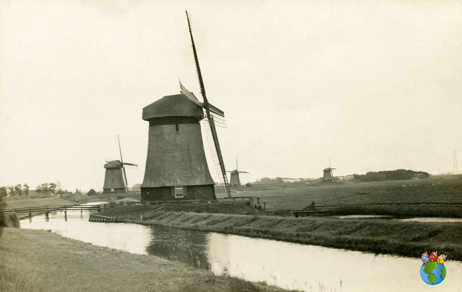 De foto is genomen in het zomerseizoen wanneer bij normale weersomstandigheden niet gemalen behoefde te worden. Daarvoor werden de molens in "zomerlaag" gezet; zeilen en eindborden werden van de wieken afgenomen, vangstokken naar binnen gehaald en alle molens stonden keurig en strak op het westnoordwesten.