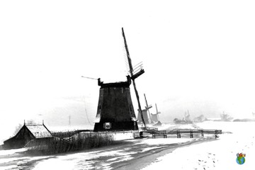 De molens tussen Driehuizen en West-Graftdijk in winterse omstandigheden. Waarschijnlijk zien we hier de middenmolens 5, 6 en 7.Â