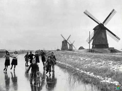 Er wordt hier geschaatst op de Noordervaart, nabij de Molengroep Schermerhorn. De foto is genomen in de richting van Schermerhorn.